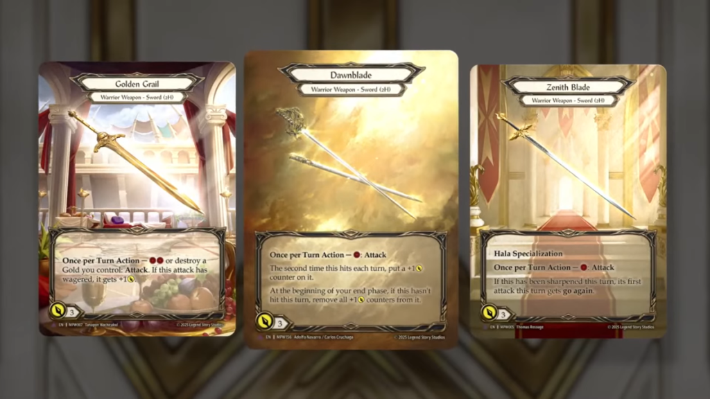 These are the Marvel printings of the swords of the Mastery Pack Warrior heroes, yet we can expect Golden Grail to be in the Armory Deck.